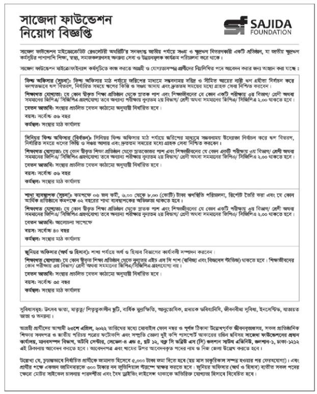 সাজেদা ফাউন্ডেশন নিয়োগ বিজ্ঞপ্তি ২০২২ঃ সাজেদা ফাউন্ডেশন মাইক্রোয়েডিট রেগুলেটরী অথরিটি’র সম্পগুপ্ত জাতীয় পর্যায়ে না বিতরণকার একটি প্রতিষ্ঠান, যা জাতীয় জায়গ কর্মসূচির পাশাপাশি শিক্ষা, স্বাস্থ্য, সমাজকল্যাণসহ অচেনা সেবা ও উন্নয়নমূলক কার্যক্রম পরিচালনা করে থাকে। সাজেদা ফাউন্ডেশন মাইক্রোফাইন্যান্স কর্মসূচিতে কাজ করতে আগ্রহী ও যোগ্যতাসম্পন্ন প্রাণীদের নিম্নলিখিত পদে আবেদন করার জন্য আহ্বান করা যাচ্ছে।