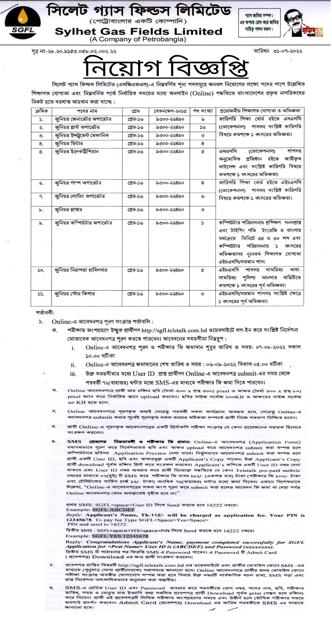 সিলেট গ্যাস ফিল্ড লিমিটেড নিয়োগ বিজ্ঞপ্তি ২০২২ঃ সিলেট গ্যাস ফিল্ডস লিমিটেড (এসজিএফএল)-এ নিম্নবর্ণিত শূন্য পদসমূহে জনবল নিয়োগের লক্ষ্যে পদের পাশে উল্লেখিত পদের নাম শিক্ষাগত যোগ্যতা এবং নিম্নবর্ণিত শর্তে নির্ধারিত সময়ের মধ্যে অনলাইন (Online) পদ্ধতিতে বাংলাদেশের প্রকৃত নাগরিকদের নিকট হতে দরখাস্ত আহবান করা যাচ্ছে।