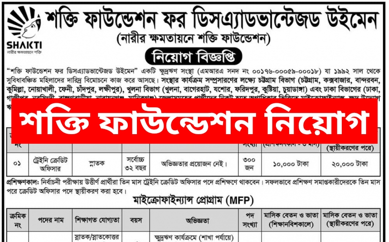 শক্তি ফাউন্ডেশন ফর উইমেন একটি ক্ষুদ্রঋণ সংস্থা (এমআরএ সনদ নং ০০১৭৬-০০০৫৯-০০০১৮) যা ১৯৯২ সাল থেকে সুবিধাবঞ্চিত মহিলাদের দারিদ্র বিমোচনে কাজ করে আসছে। সংস্থার কার্যক্রম সম্প্রসারণের লক্ষ্যে চট্টগ্রাম বিভাগ (চট্টগ্রাম, কক্সবাজার, বান্দরবন, কুমিল্লা, নোয়াখালী, ফেনী, চাঁদপুর, লক্ষীপুর), খুলনা বিভাগ (খুলনা, বাগেরহাট, যশোর, ফরিদপুর, কুষ্টিয়া, চুয়াডাঙ্গা) এবং ঢাকা বিভাগের (ঢাকা, গাজীপুর, নরসিংদী, ব্রাহ্মণবাড়ীয়া, নারায়নগঞ্জ, মানিকগঞ্জ) জেলাসমুহের প্রার্থীদের নিকট হতে অগ্রাধিকার ভিত্তিতে মাইক্রোফাইন্যান্স, ক্ষুদ্র উদ্যোগ ঋণ এবং হেলথ কার্যক্রমে নিম্নোক্ত পদের জন্য দরখাস্ত আহবান করা হচ্ছে। এছাড়াও অন্যান্য জেলার প্রার্থীরাও আবেদন করতে পারবেন।