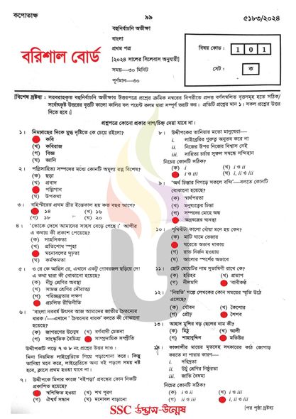 বরিশাল বোর্ড এসএসসি বাংলা ১ম পত্র প্রশ্ন সমাধান ২০২৪