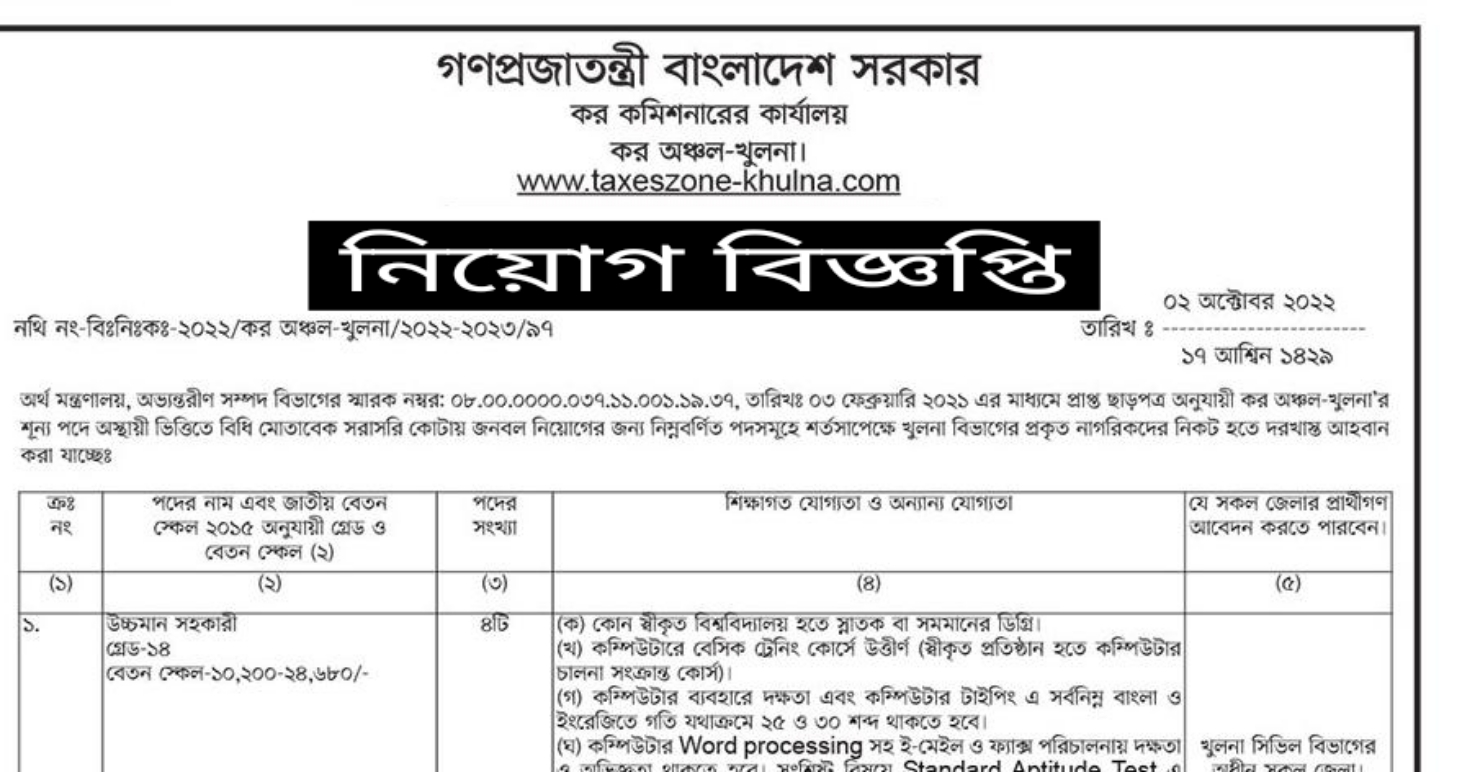কর কমিশনারের কার্যালয় নিয়োগ বিজ্ঞপ্তি ২০২২ (Tax Commissioner Office Job Circular 2022): কর অঞ্চল-খুলনা’র শূন্য পদে অস্থায়ী ভিত্তিতে বিধি মোতাবেক সরাসরি কোটায় জনবল নিয়োগের জন্য নিম্নবর্ণিত পদসমূহে শর্তসাপেক্ষে খুলনা বিভাগের প্রকৃত নাগরিকদের নিকট হতে দরখাস্ত আহবান করা যাচ্ছে।