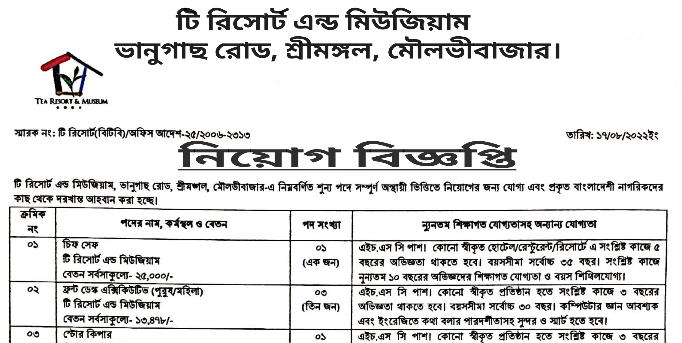 টি রিসোর্ট এন্ড মিউজিয়াম নিয়োগ বিজ্ঞপ্তি ২০২২ঃ টি রিসোর্ট এন্ড মিউজিয়াম, ভানুগাছ রোড, শ্রীমঙ্গল, মৌলভীবাজার-এ নিম্নবর্ণিত শূন্য পদে সম্পূর্ণ অস্থায়ী ভিত্তিতে নিয়োগের জন্য যোগ্য এবং প্রকৃত বাংলাদেশী নাগরিকদের কাছ থেকে দরখাস্ত আহবান করা হচ্ছে।