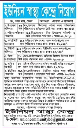 ইউনিয়ন স্বাস্থ্য কেন্দ্র নিয়োগ ২০২২