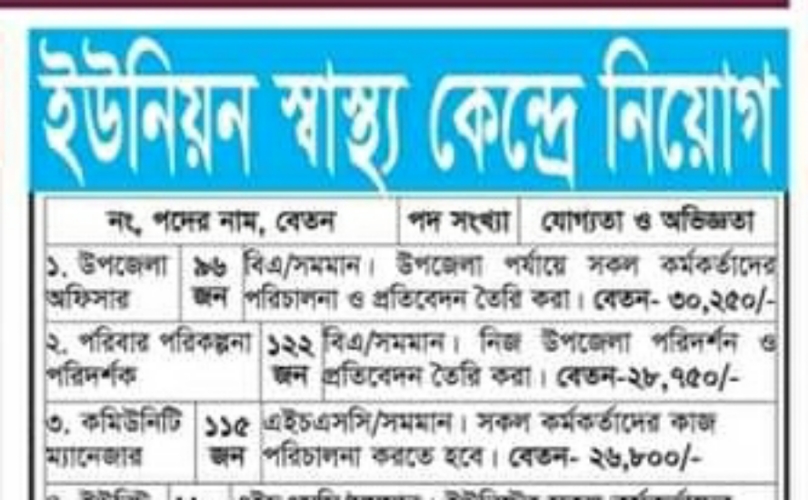 ইউনিয়ন স্বাস্থ্য কেন্দ্র নিয়োগ বিজ্ঞপ্তি